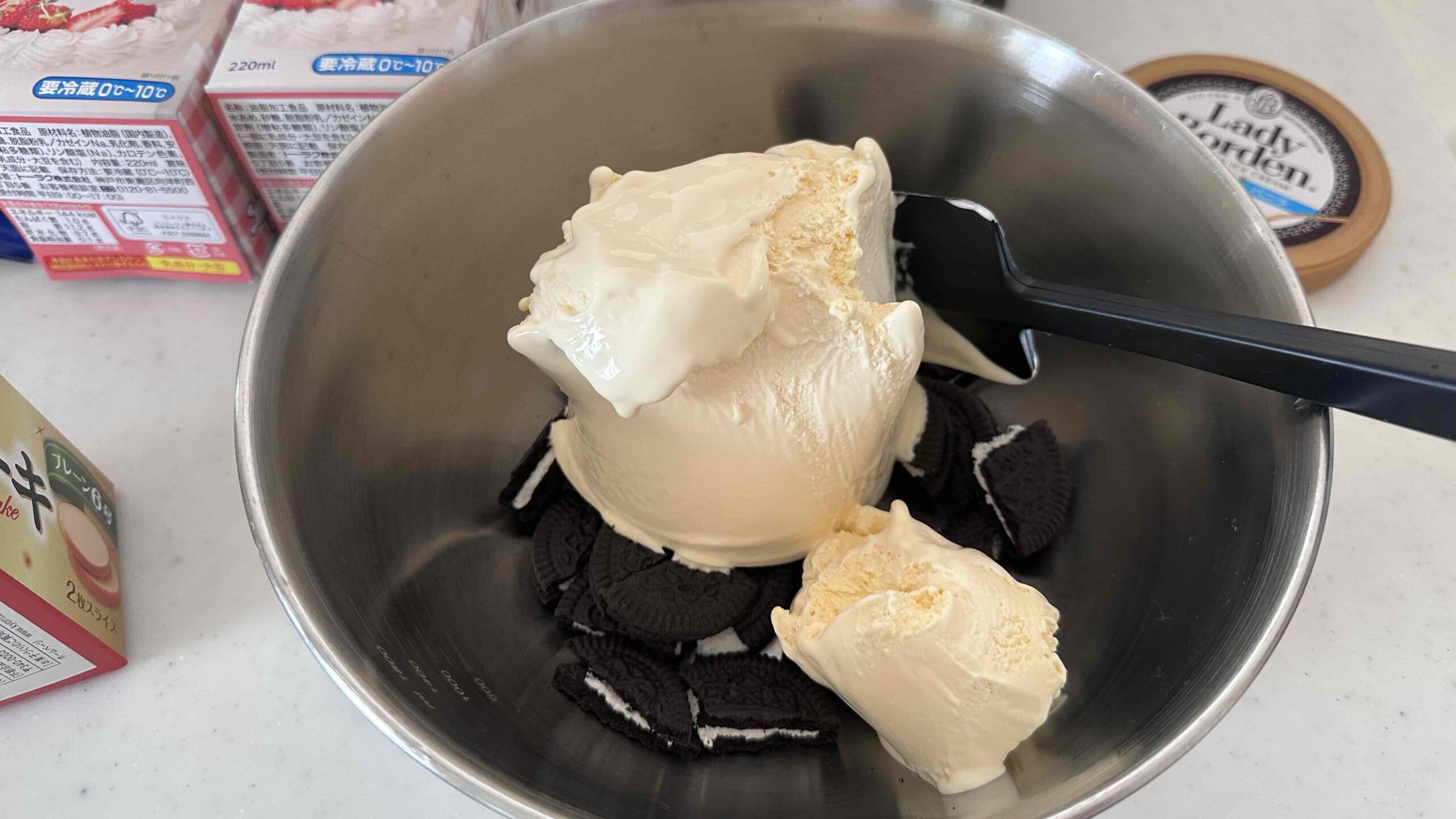④のクッキーを混ぜて、クッキー&クリームにしたかったので、バニラアイスを用意しました。お好みのフレーバーを用意しましょう。