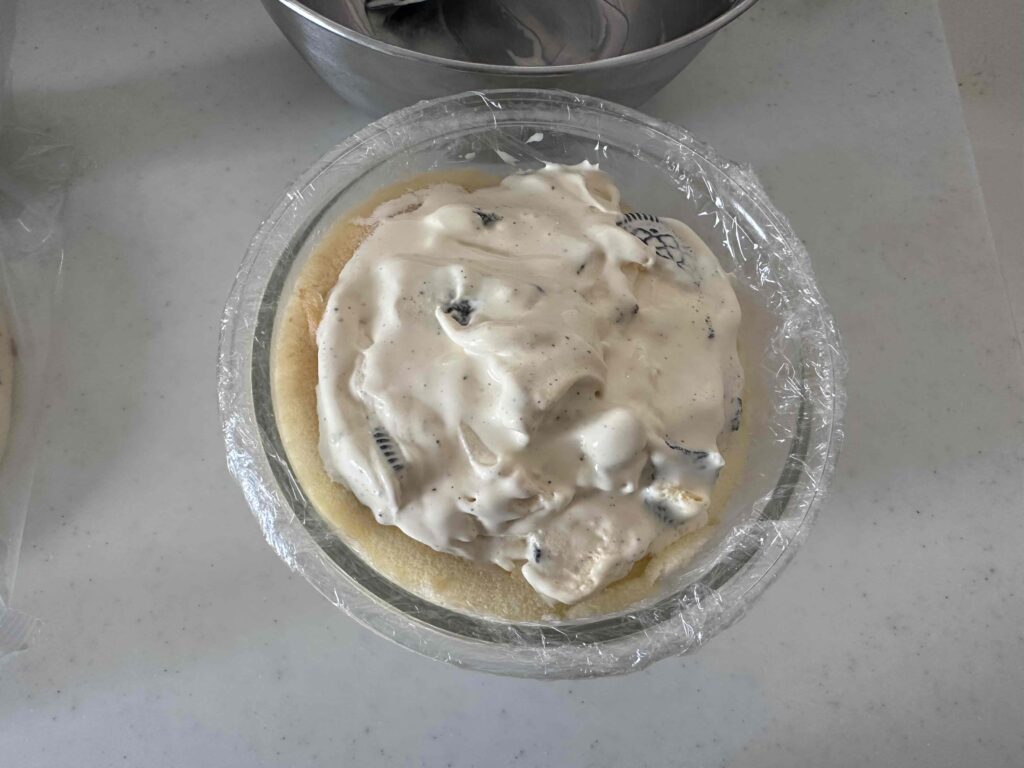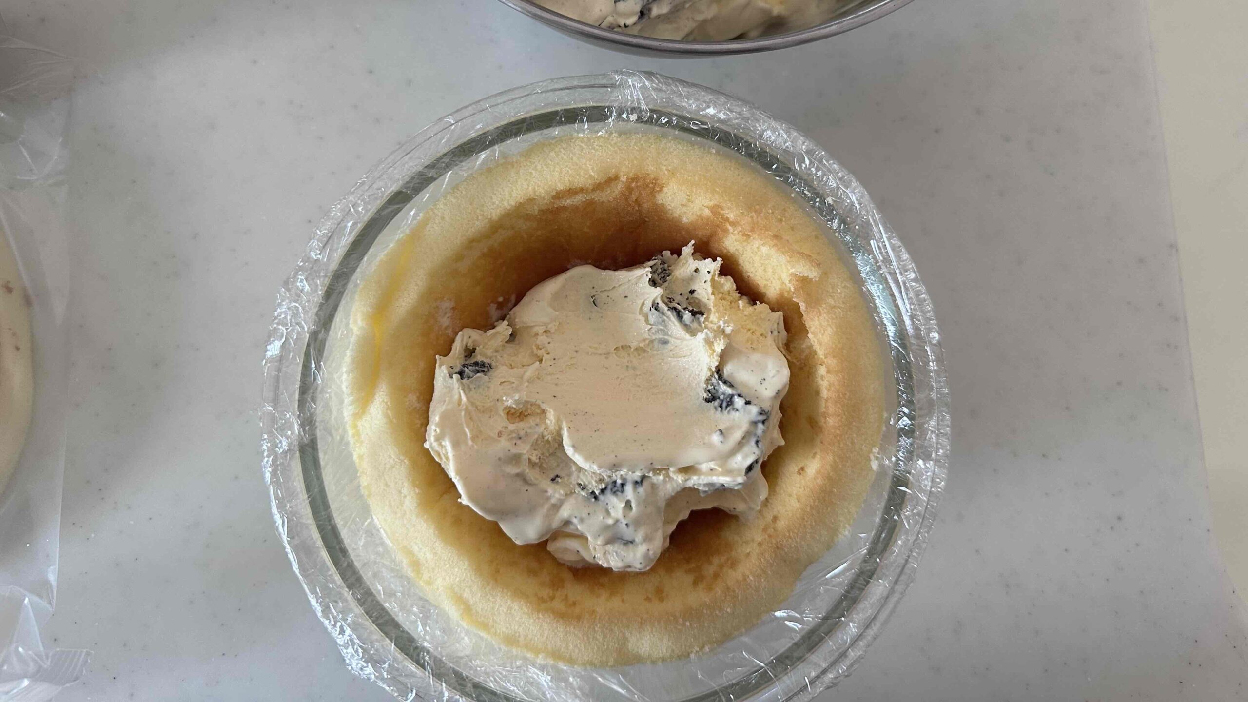 5、スポンジケーキを敷いたボウルの中にアイスを入れます。