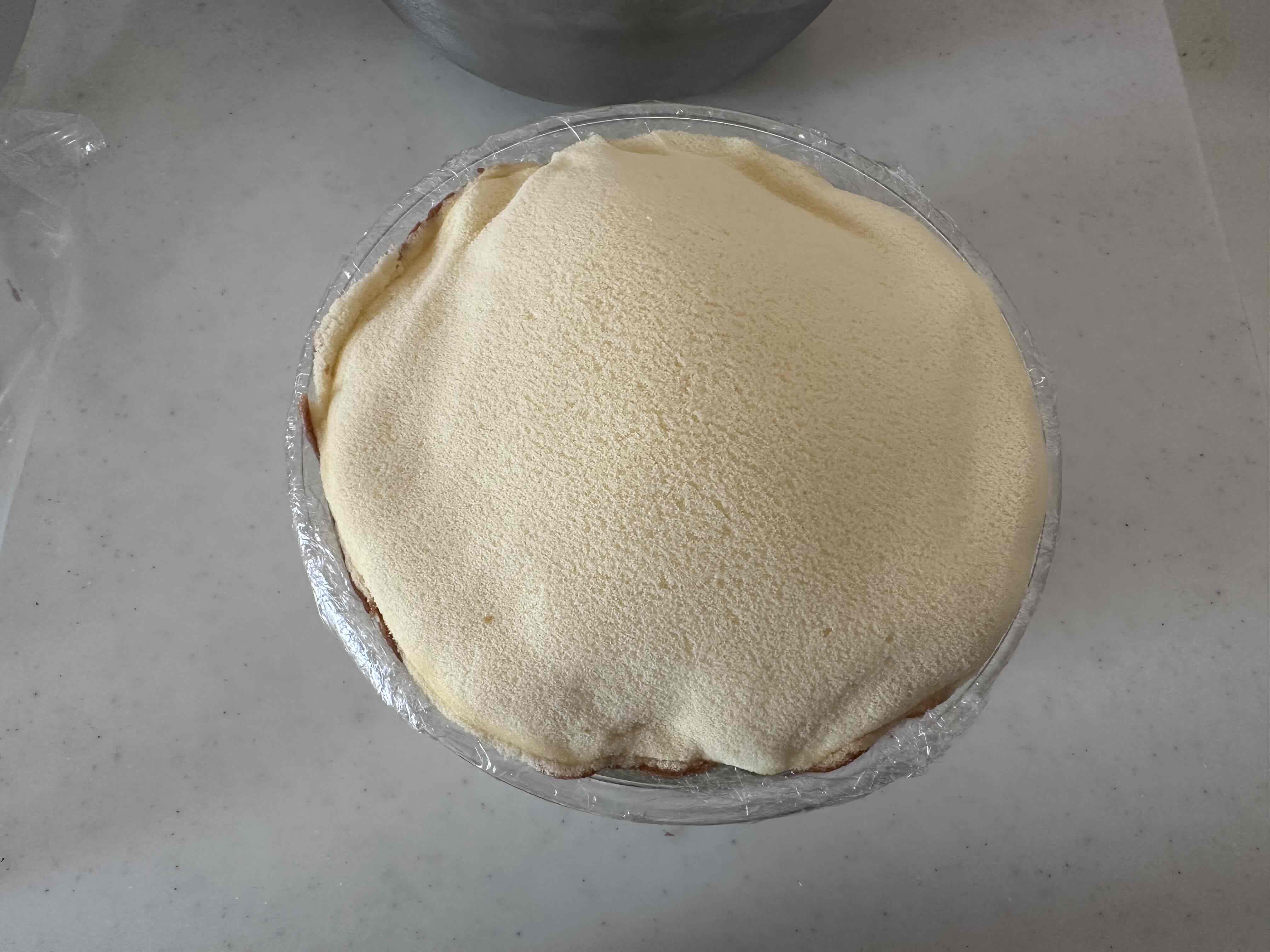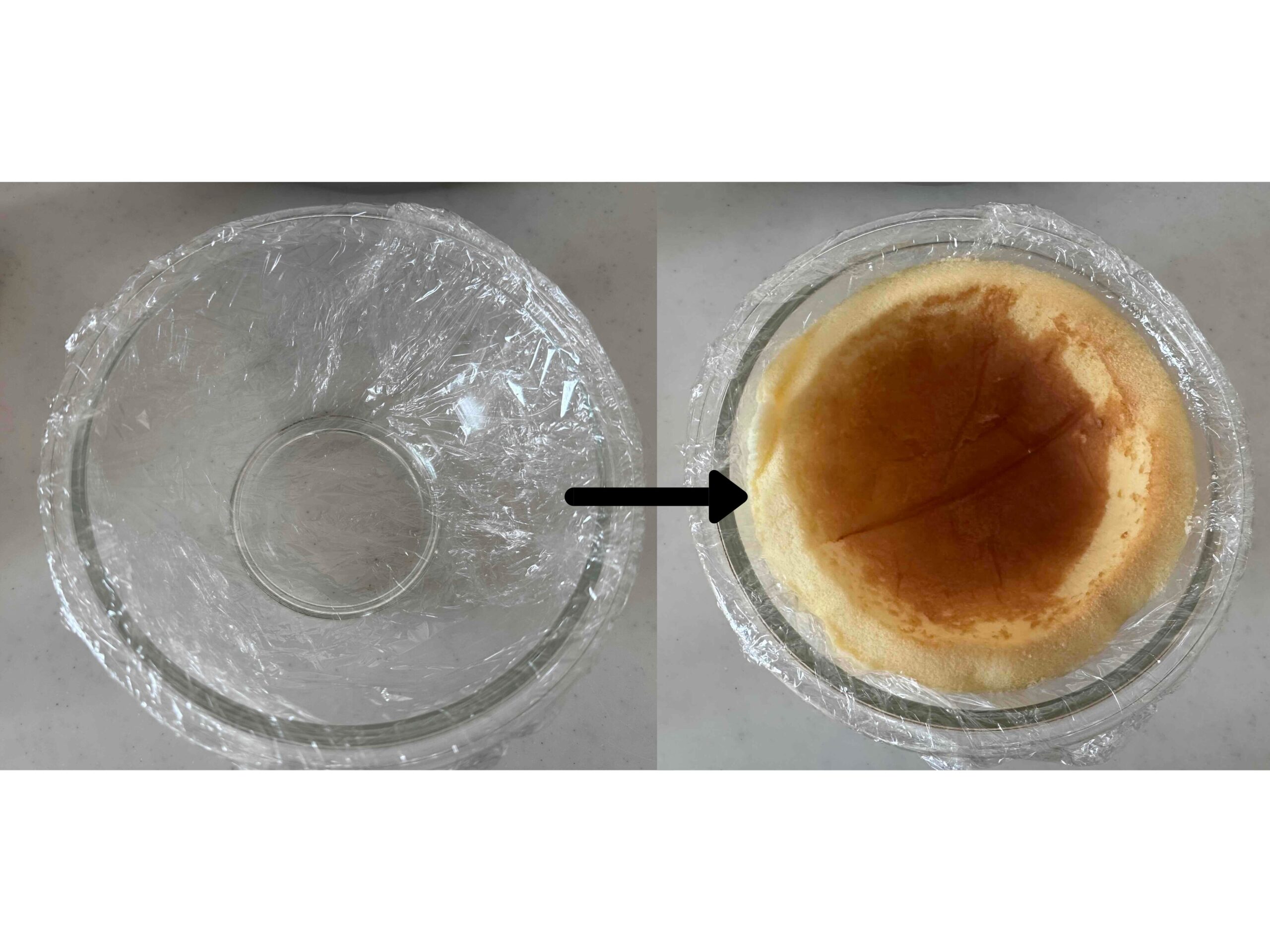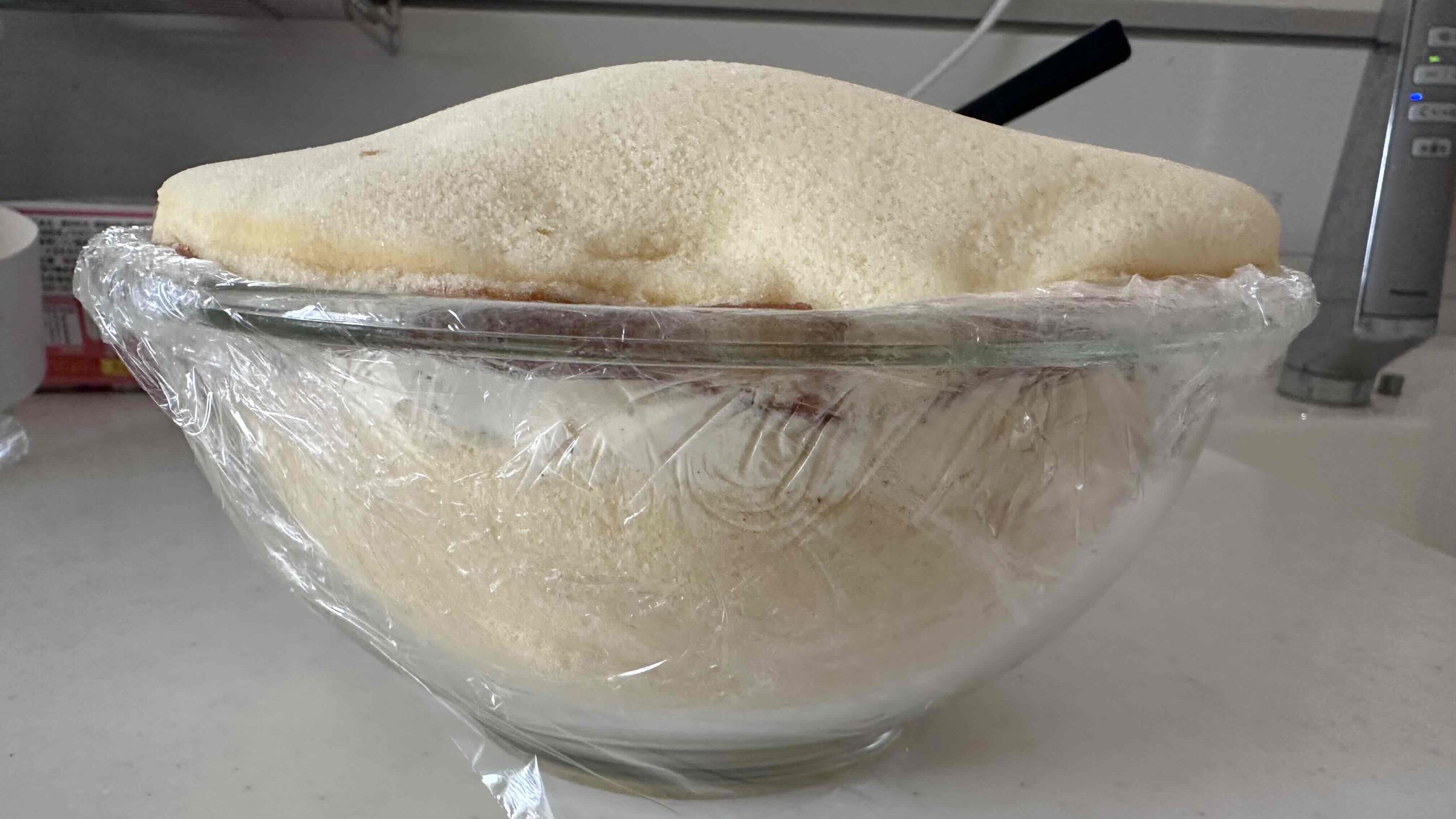 事前準備:ボウルにラップをして、スポンジケーキを1枚敷いておきます。
