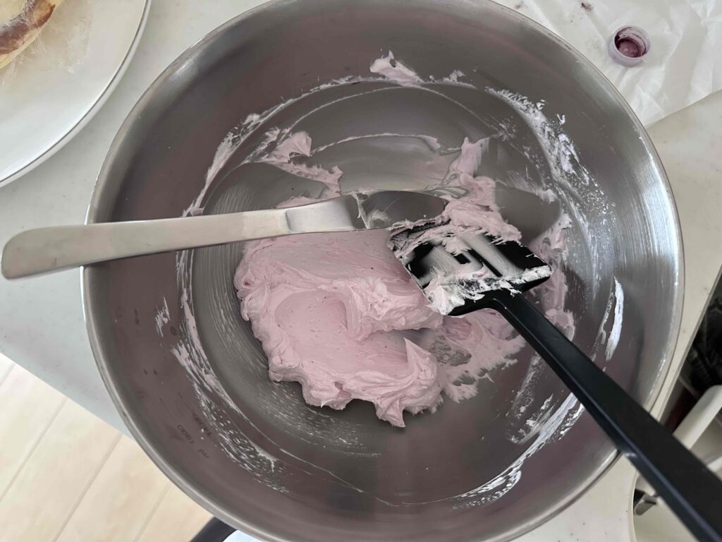 8、その間に、食紅で生クリームに色を付けて、ムラがないようよく混ぜます。