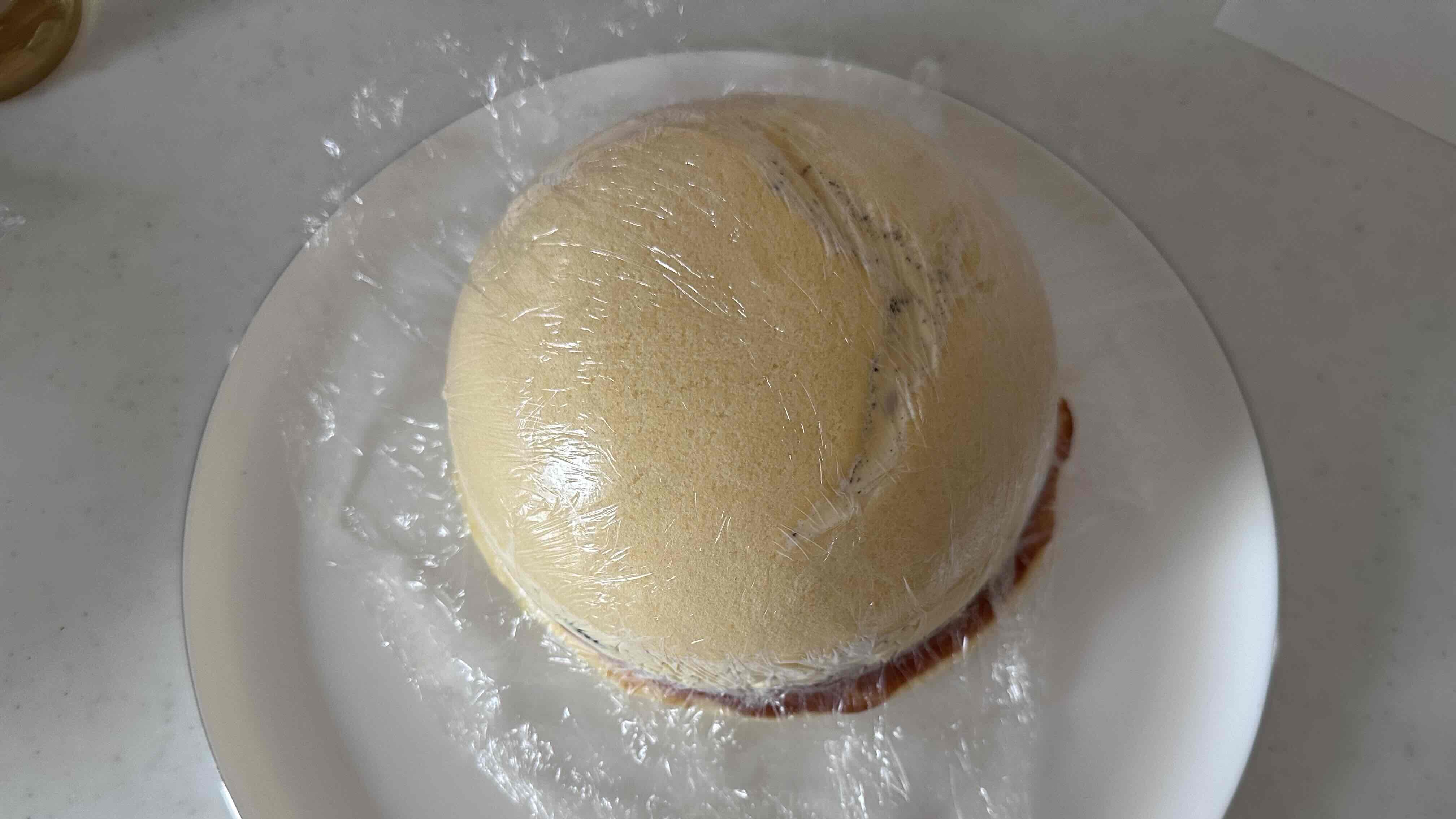 6、アイスを入れたら、もう一枚のスポンジケーキでふたをして、ラップします。